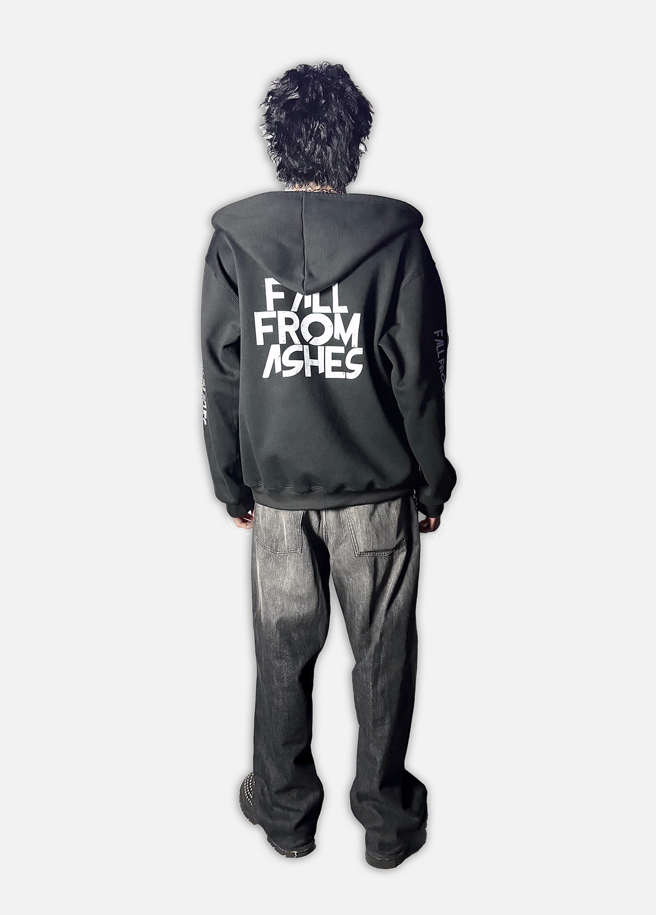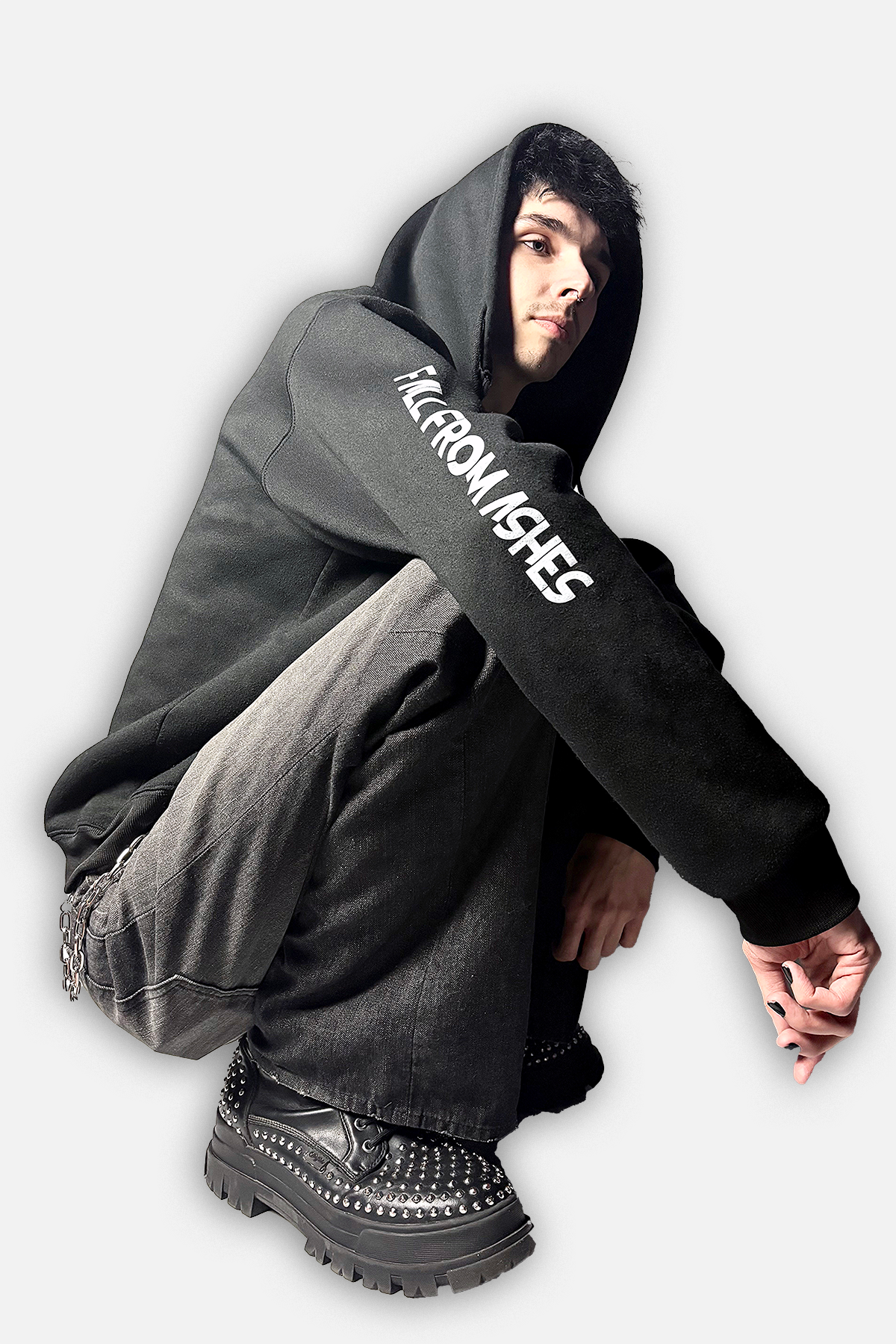 Black zip-up hoodie from the Fall from Ashes Original Collection. A large, contrasting FALL FROM ASHES print on the back grabs attention, while stylized lettering runs along the sleeves, echoing the same motif. Made from soft, comfortable fabric — perfect for concerts and everyday wear.